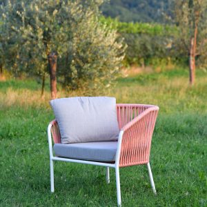 Poltrona, lounge e divano Claire con telaio in alluminio verniciato a polvere e corda intrecciata, come optional cuscini imbottiti. Adatti all’outdoor e ben solidi.